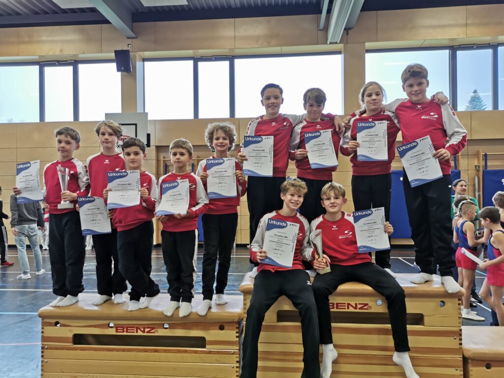 Der TSV Teisendorf empfing die Landshuter Turner am Samstagmorgen, 09. November 2024, zum Regionalentscheid. Zwei Mannschaften mit sechs bzw. fünf motivierten Turnern reisten samt Betreuer, Kampfrichter und natürlich heimischen Fans an, um ihre Leistungen beim Regionalentscheid unter Beweis zu stellen. Insgesamt neun Mannschaften in drei unterschiedlichen Wettkampfklassen zeigten schöne Übungen an den sechs Geräten Boden, Pferd, Ringe, Sprung, Barren und Reck. Erleichtert nach einem verletzungsfreien und gut organisierten Wettkampf, durften die Turner der TG Landshut bei der Siegerehrung dann richtig jubeln. Die jüngere Mannschaft in der Wettkampfklasse 4 (Jahrgang 2013 – 2014) mit Jakob Willer, Leon Westermeier, Daniel Scholz, Tom Mürdter und Martin Voikov erreichte den zweiten Platz auf dem Stockerl. Ihre Teamkollegen (Jahrgang 2011-2012) durften sogar ganz nach oben. So freuten sich Lukas Westermeier, Vinzenz Kölbl, Lorenz Vohburger, Florian Förster, Maximilian Betz und Ilian Hegel über den Sieg in der Wettkampfklasse 3. Zur großen Freude qualifizierten sich die sechs Sportler gleich noch für den Landesentscheid am 24. November in Michelau.