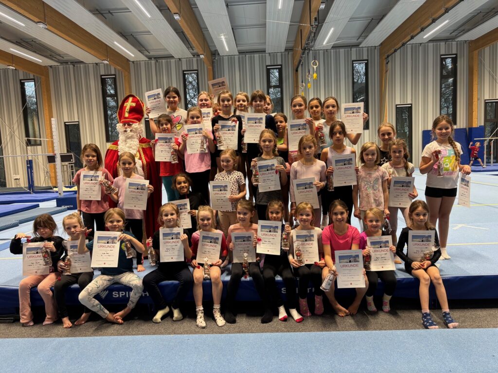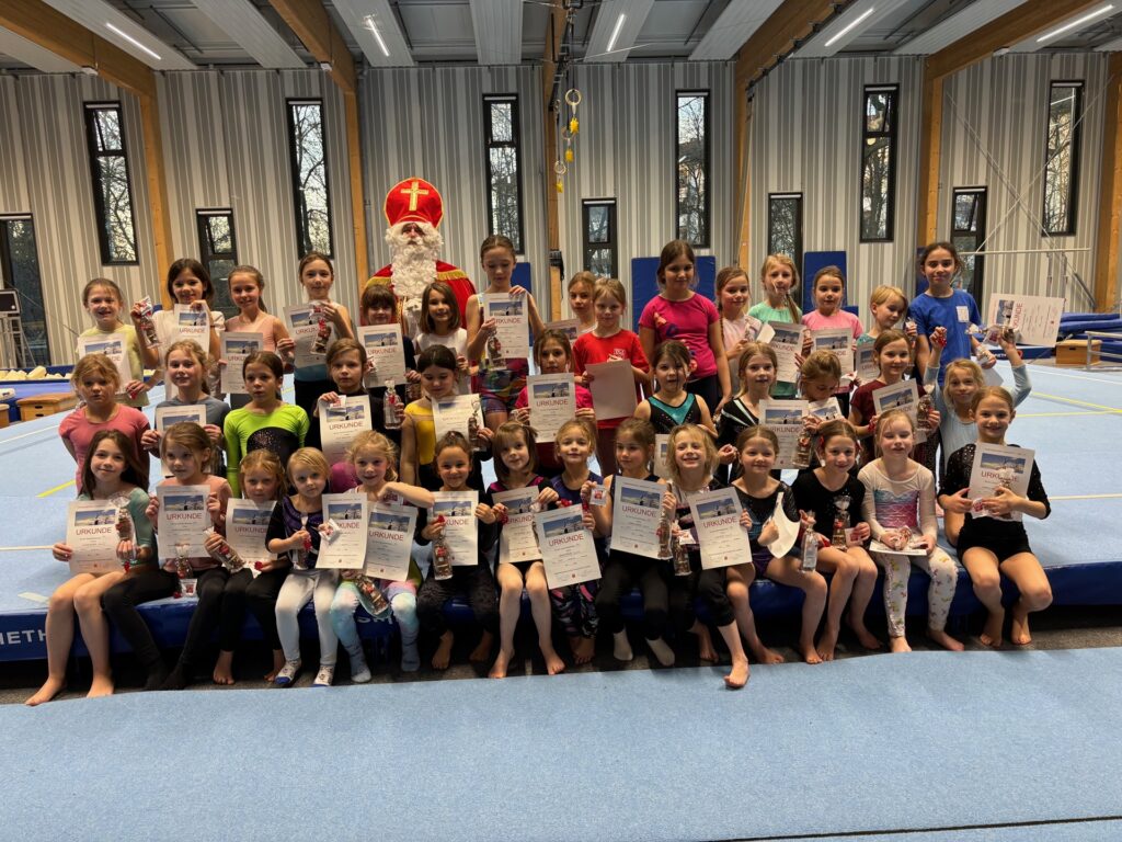 Für die meisten der über 70 Mädchen im Alter zwischen 7 und 9 Jahren war es der erste Wettkampf vor Publikum. Gebannt verfolgten Eltern und Zuschauer die Übungen der Turnerinnen an den Geräten. Die P-Übungen des Deutschen Turnerbundes wurden seit Wochen mit den Übungsleitern in den Stunden am Dienstag bzw. Freitag von jeweils 14 bis 16 Uhr fleißig trainiert und durften nun einzeln vorgeturnt werden. Die Nervosität war für alle spürbar, denn es hatte sich noch ein besonderer Gast im Zuschauerraum blicken lassen. Der Nikolaus schaute zu und war von den Leistungen der Turnerinnen sichtlich beeindruckt. Mit einer Urkunde und natürlich einem Schokoladen-Nikolaus strahlten die kleinen Sportlerinnen am Ende um die Wette.